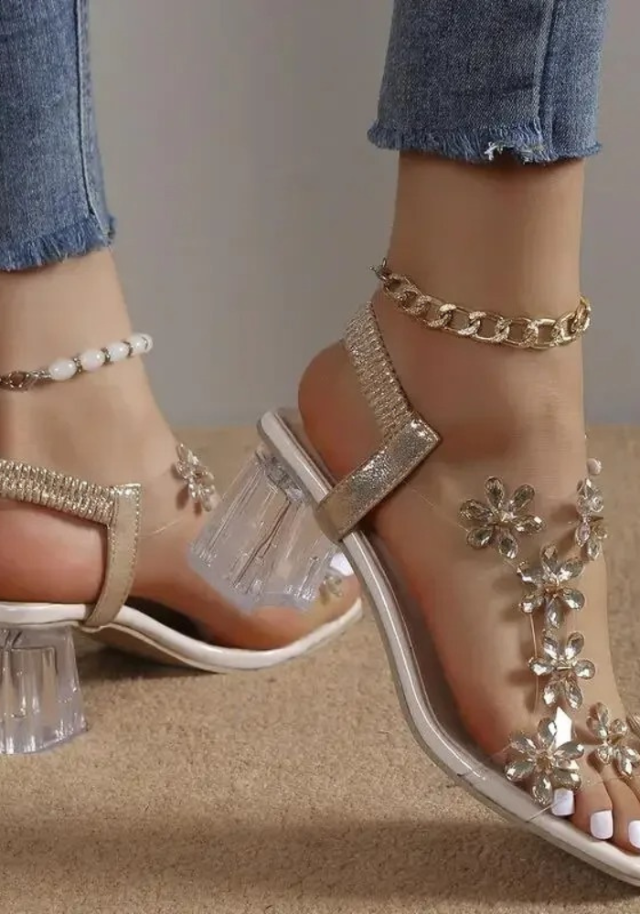 Luce sofisticada y radiante con estas exquisitas sandalias de tacón transparente, diseñadas para destacar en cualquier ocasión. Con delicados apliques florales en pedrería que recorren elegantemente el empeine, estas sandalias combinan feminidad, brillo y estilo en una sola pieza.